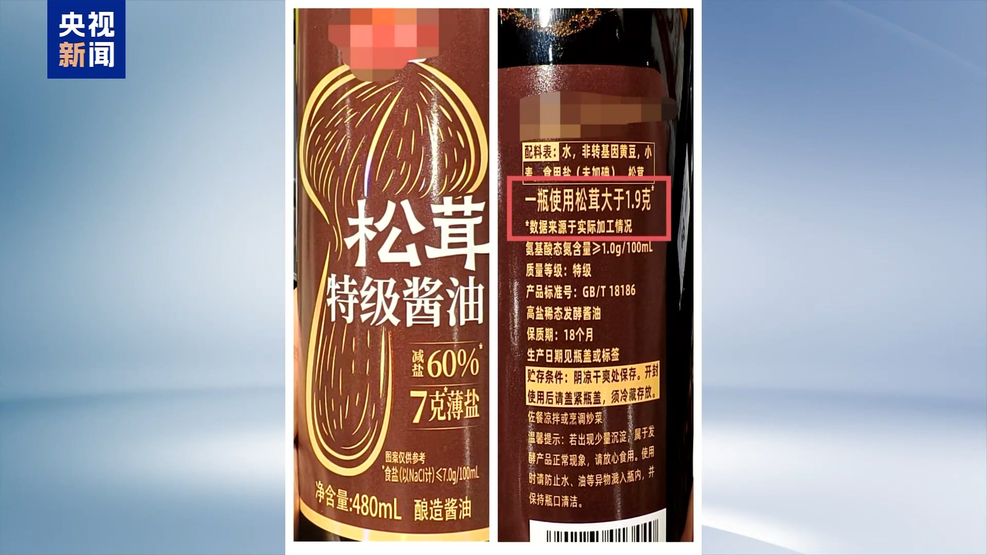 而另外一款容量480毫升的松茸特级酱油中,配图是一个占比巨大的松茸形象,但配料表显示一瓶酱油使用的松茸大于1.9克。