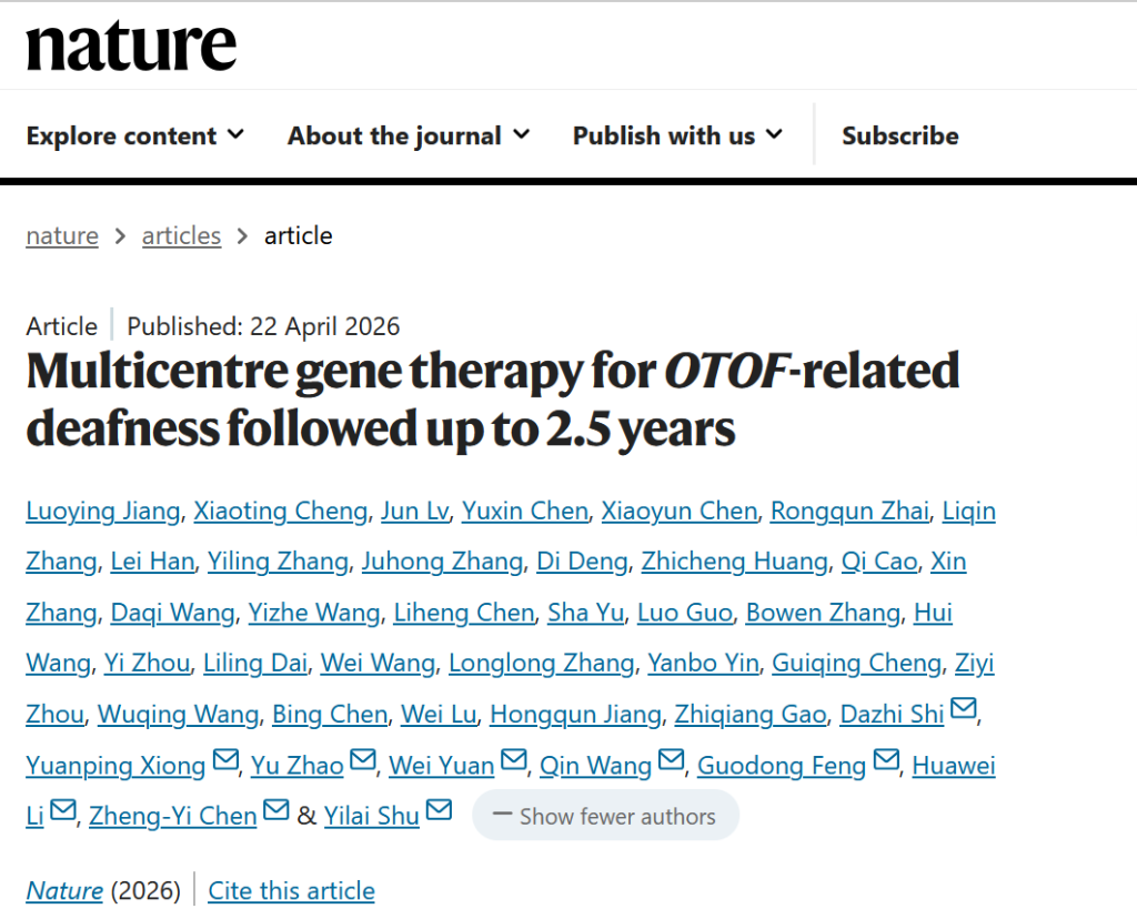 4月22日,复旦大学附属眼耳鼻喉科医院舒易来教授领衔的先天性耳聋基因治疗多中心临床研究,在国际期刊《自然》(Nature)正式在线发表。这项针对OTOF先天性耳聋的基因治疗研究,发布了长达2.5年的结果,并发现预判临床疗效的核心生物标志物。这不仅是耳聋基因治疗领域全球开展最早、纳入患者最多、随访时间最长的临床研究,更覆盖目前全球报道中最小至最大年龄(9个月~32岁)的患者,为先天性耳聋的治疗打开全新局面,是中国从创新研发到临床应用的典范。