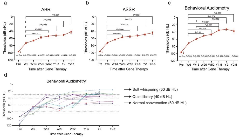 治疗有效患者的ABR、ASSR及行为测听阈值(从给药前至随访2.5年)。研究图示